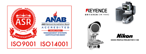 特殊板ばね・線ばね製造.comではISO9001・14001認証を取得し、お客様に提供する製品の品質ならびに、製造工程における環境配慮を行っています。また、当社が手掛けるすべての製品は材料のミルシート管理ならびに、量産時における抜き取り検査を実施しています。また、試作・量産品問わず、当社検査工程における検査結果のデータ化を行い、お客様にご安心いただける管理体制を築き上げています。